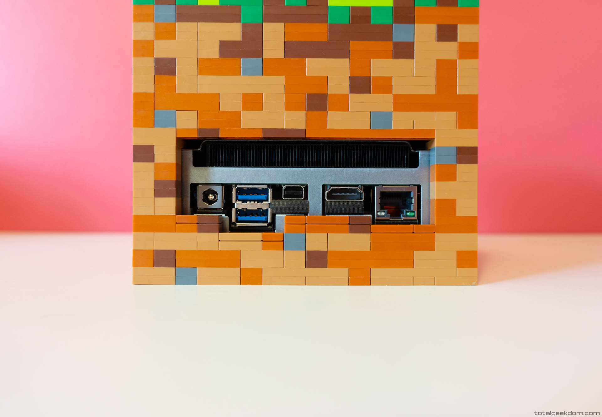 The Lego case perfectly wraps around the NUC system, and allows access to all ports in the rear of the system. Additionally, slots were built into the sides of the case which allow for the normal NUC cooling system to function as designed, with fresh air being drawn in through the sides and then expelled out of the rear of the system. Also, I built these slots to incorporate the built-in card reader slot, which allows the case to not impact the cooling performance in any way, as the system, when tested, runs at the same temperatures as a completely unmodified NUC system.
